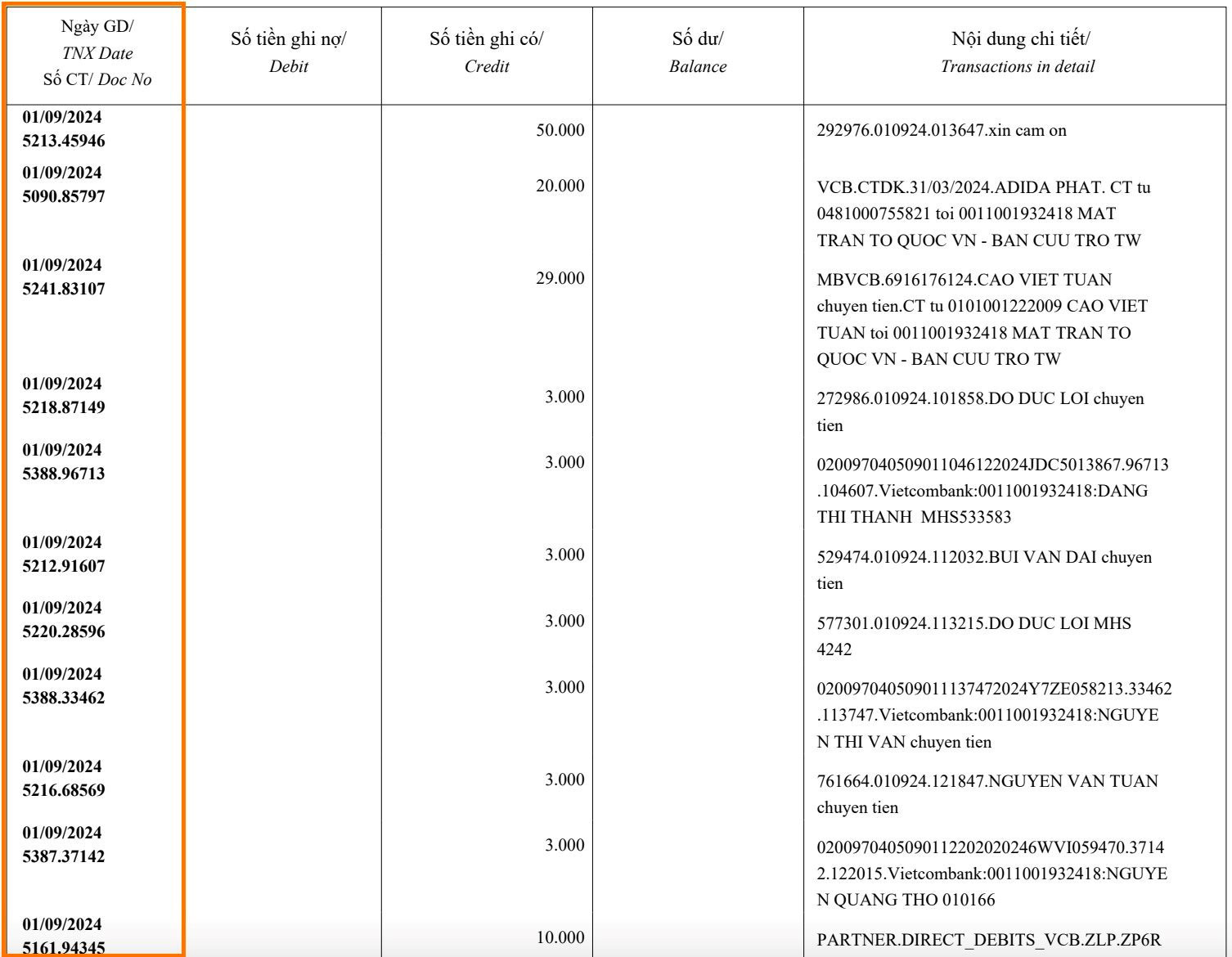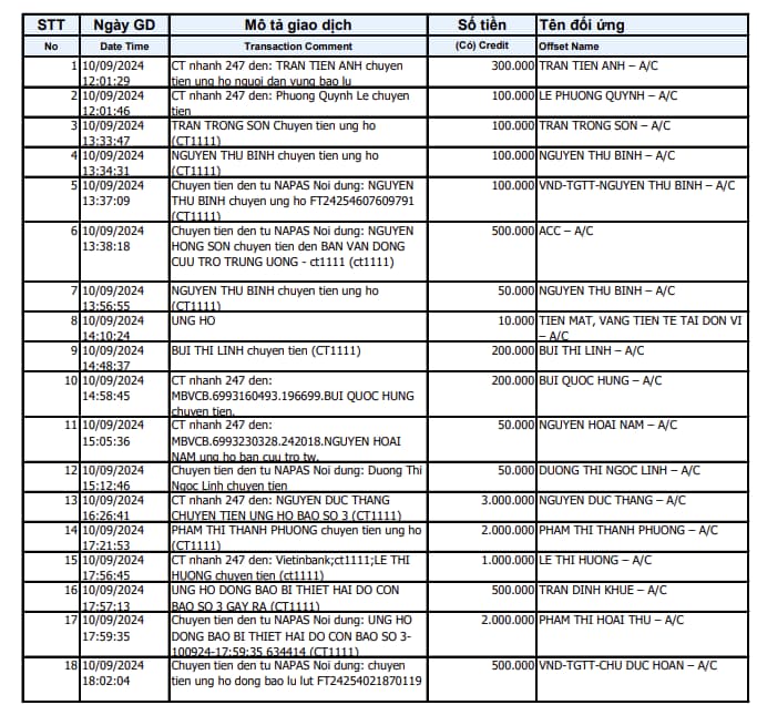 Ngày 14/9/2024, Uỷ ban Trung ương Mặt trận Tổ quốc Việt Nam đã công bố bảng “sao kê” với hơn 12.000 trang. Ngày 16/9/2024, Uỷ ban Mặt trận tiếp tục công bố 9.194 trang “sao kê”. Qua đó, Mặt trận Tổ quốc Việt Nam thực hiện công bố “sao kê” nguồn tiền từ thiện đúng theo quy định của pháp luật và để công chúng yên tâm về nguồn tiền ủng hộ được công khai, minh bạch. Mặt khác, từ bản danh sách trên, công chúng đã phát hiện một số cá nhân có dấu hiệu gian dối, trục lợi việc đóng góp từ thiện cho đồng bào bị ảnh hưởng do bão lũ. Những cá nhân trên có khả năng bị xử lý theo quy định của pháp luật và áp lực dư luận. Bản công bố “sao kê” của Mặt trận Tổ quốc trong thời gian quan được ghi nhận tích cực từ quần chúng nhân dân.